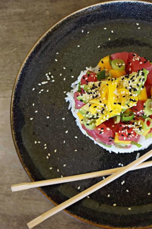 This poke is fresh and it has a bit more of a sweet/spicy kick, lovely for hot summers, with vibrant bright colors making it very attractive to the eye, simple plating and easy to enjoy!